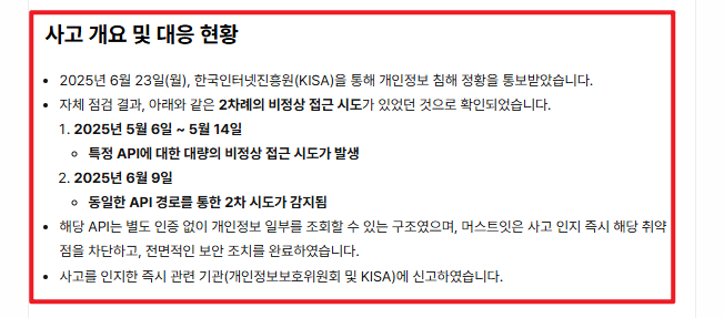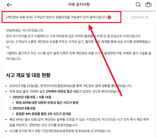 2025년 6월, 머스트잇은 한국인터넷진흥원(KISA)으로부터 개인정보 침해 정황을 통보받았습니다.