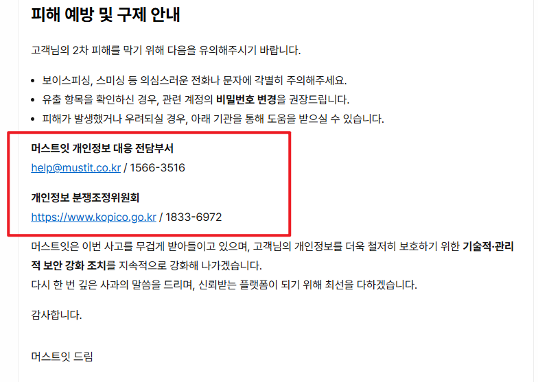 즉시 머스트잇 개인정보 대응 부서에 연락하고, 개인정보 분쟁조정위원회에 피해 사실을 접수해 도움을 요청할 수 있습니다.